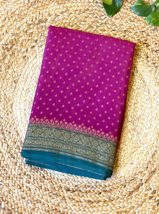 MAGENTA AND GREEN PURE CREPE BANARASI SILK SAREE