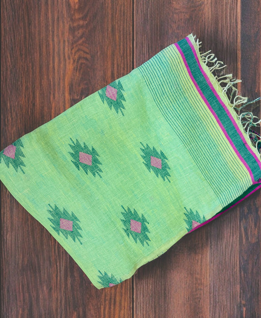 LIME YELLOW AND PINK PURE HANDLOOM LINEN SAREE