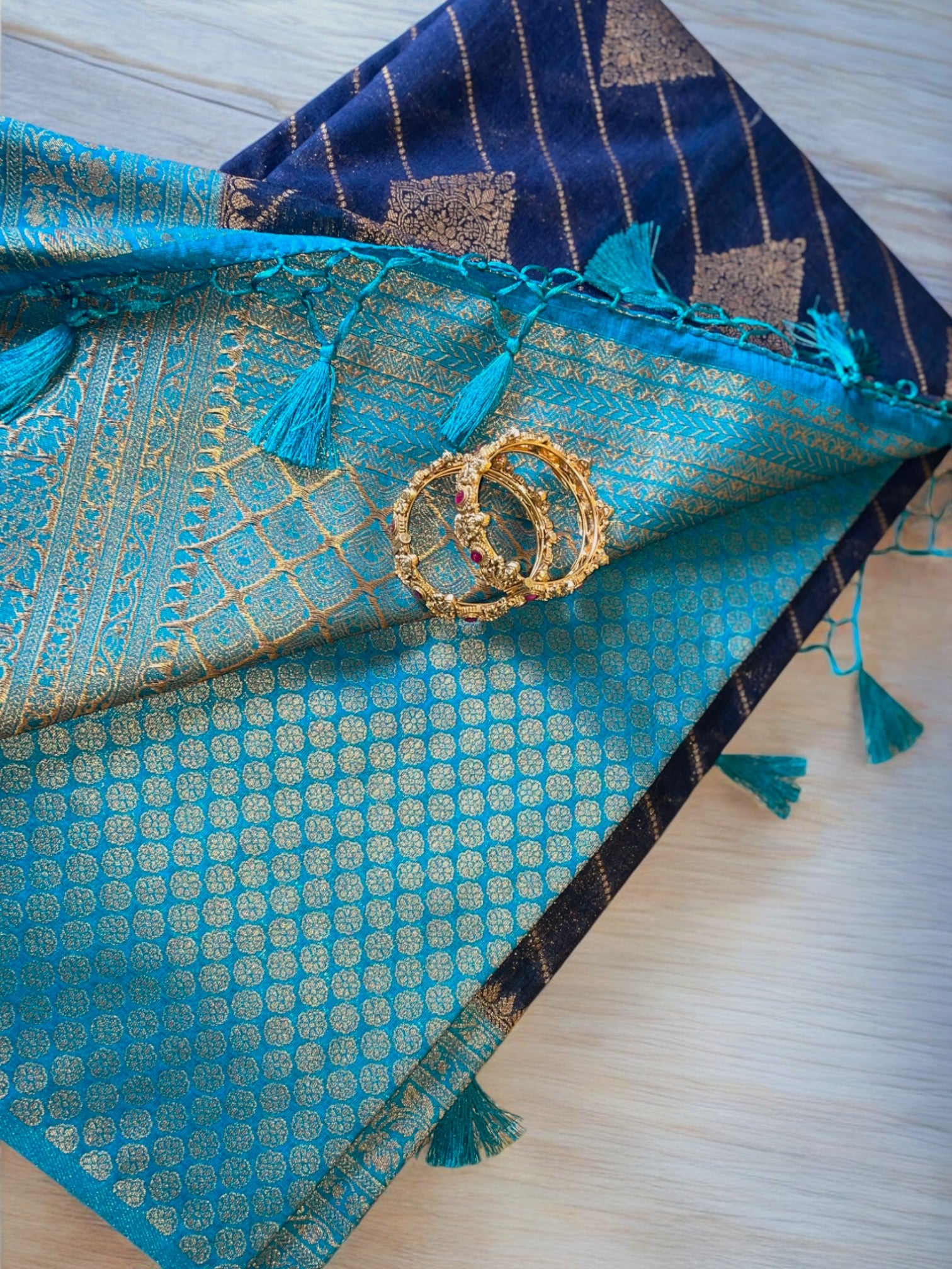 Our affordable bestseller, Navy blue with Rama blue rich Antique Zari border semi banarasi silk saree.
