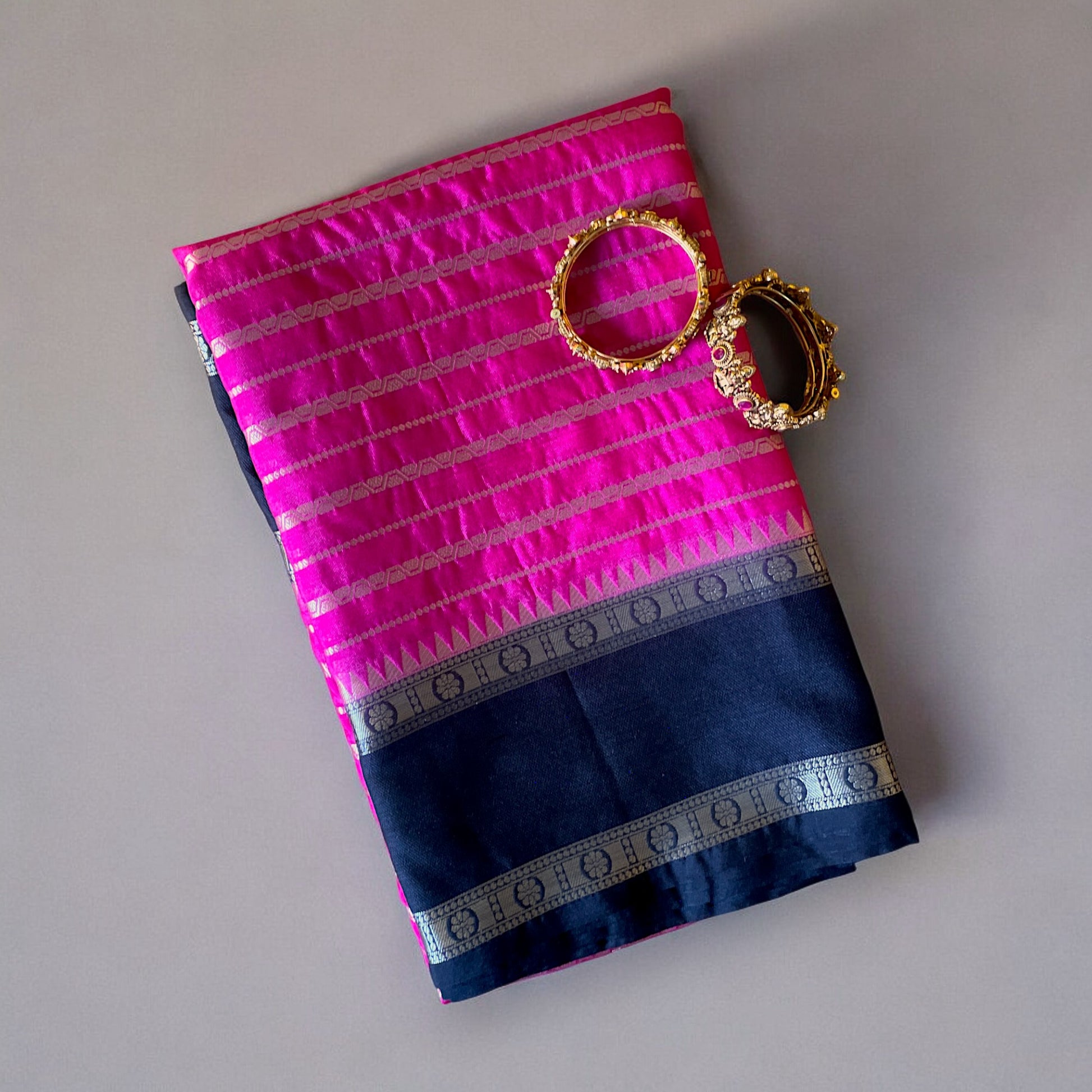 This stunning Pink and black gadwal border semi chiniya silk saree is a must-have for any wardrobe.