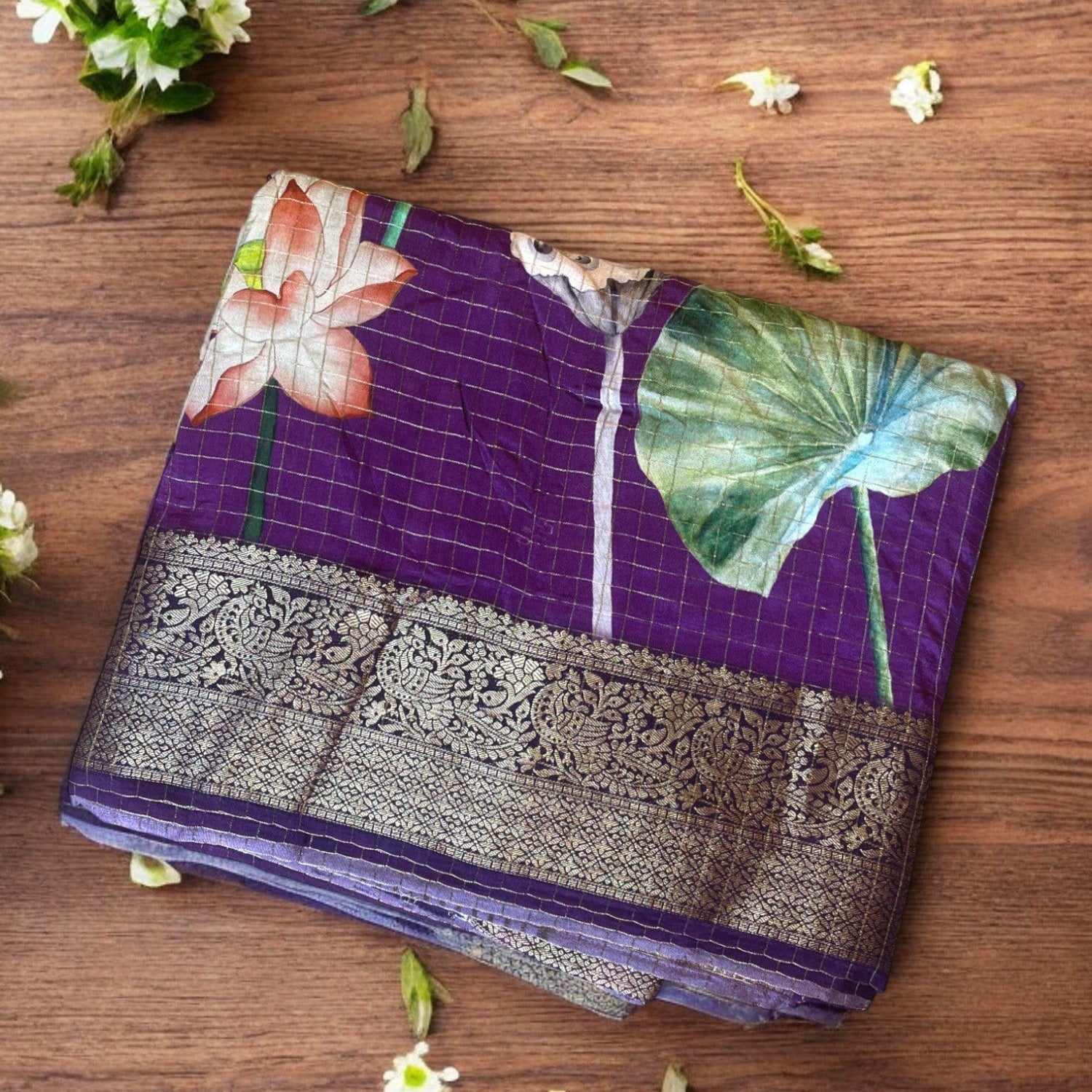 Add a vibrant elegance to your wardrobe with this beautifully printed Pure Dola Silk Saree.