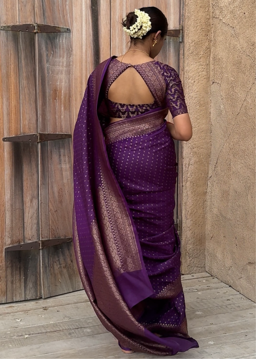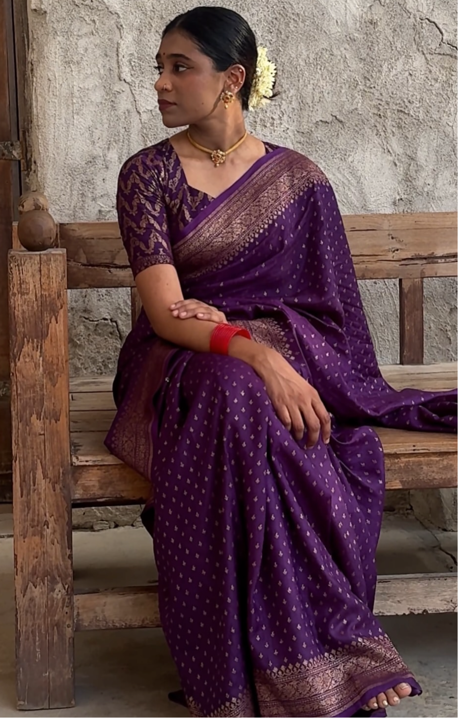 Crafted from luxurious crepe silk, this Brown Banarasi Crepe Silk Saree combines tradition and elegance with intricate golden zari work.