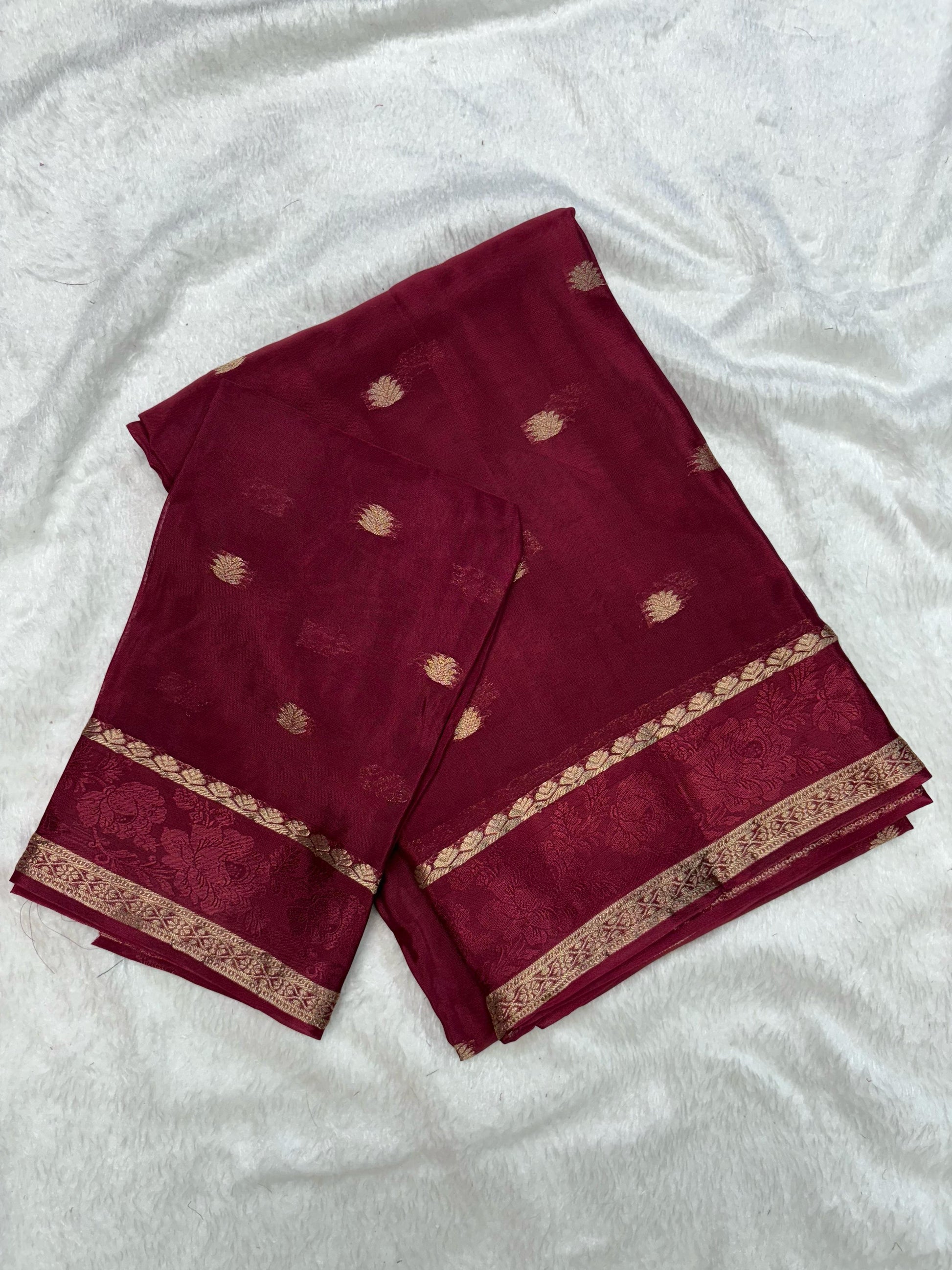 A Beautiful Cherry Red shade pure crepe chiffon saree. Lightweight and easy to wear, most loved saree.
