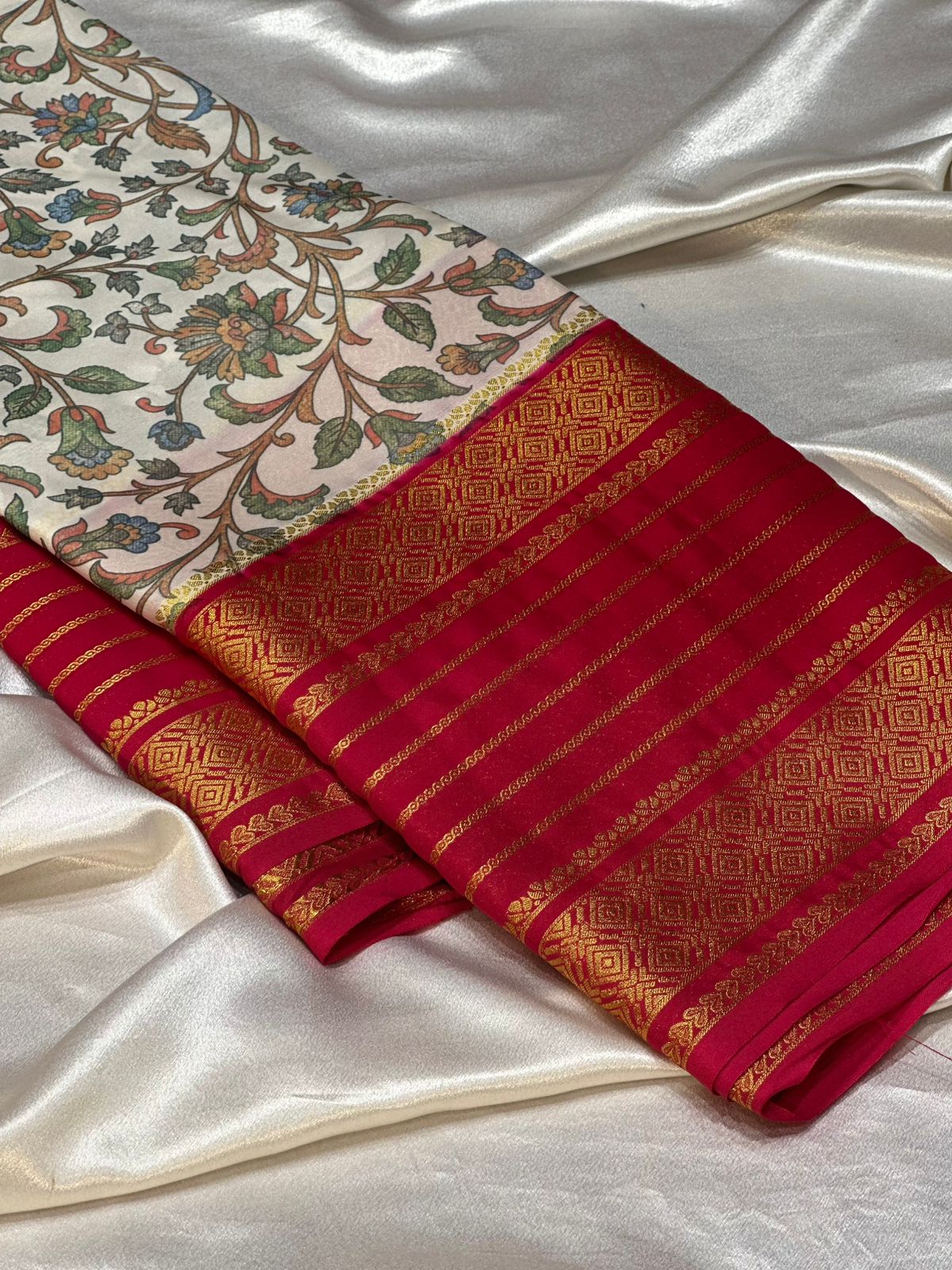 IVORY RED SEMI MYSORE CREPE SILK SAREE